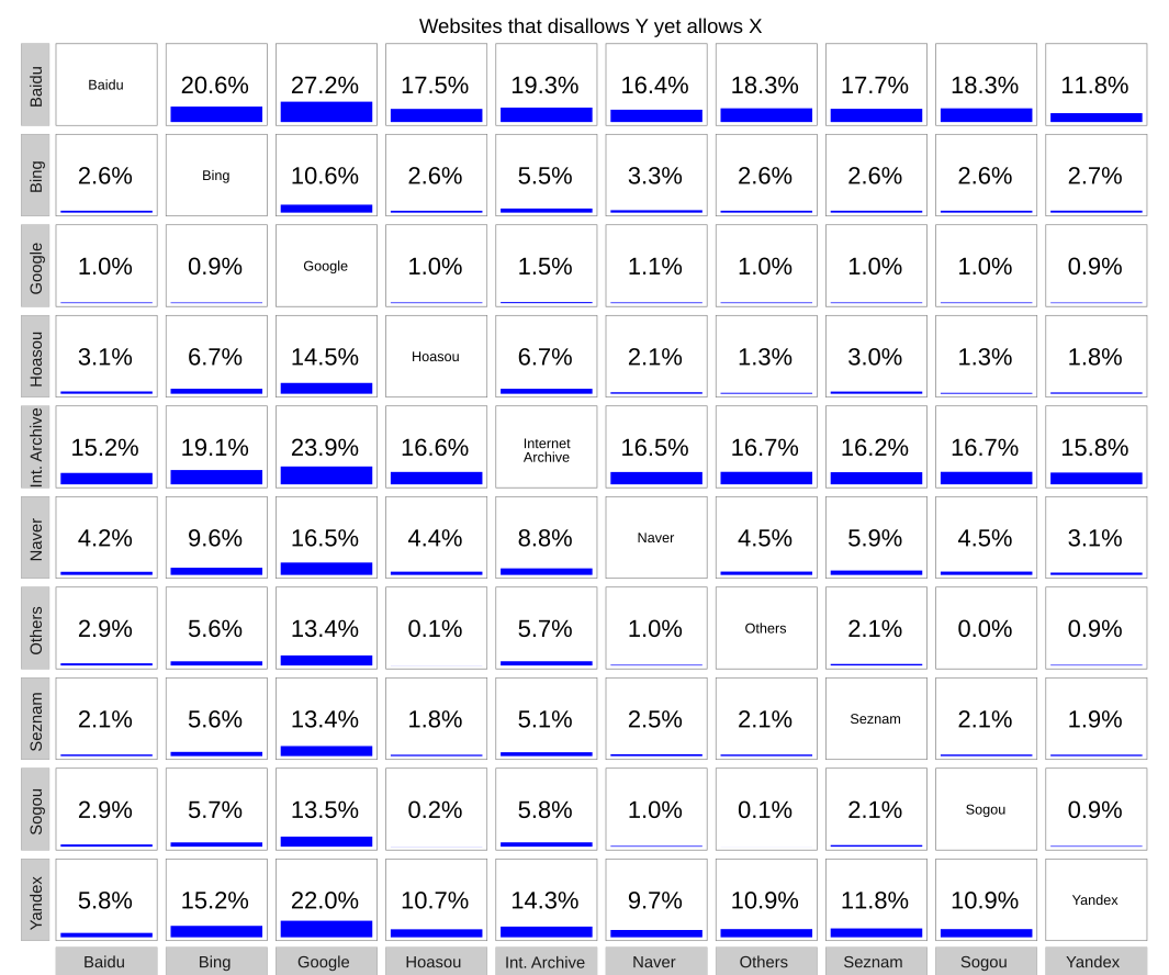 The above box grid shows the percentage of websites that block search engines on the Y-axis but allows search engines on the X-axis. From this, we can see that Googlebot gets preferential treatment on many websites that don’t allow some or all other crawlers. We can also see that many sites block Baidu and Internet Archive while allowing all other crawlers.