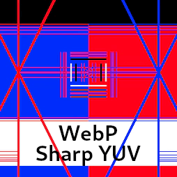 Without the sharp YUV option, the thin lines get desaturated and a bit blurry. Enabling the sharp YUV option performs gamma-correction to preserve the color contrast closer to the original color. It also preserves the thin lines under more conditions. The gamma-corrected color still bleeds the blue color into the red color and vice-versa. However, this effect is inevitable in a chroma-subsampled lossy image format.